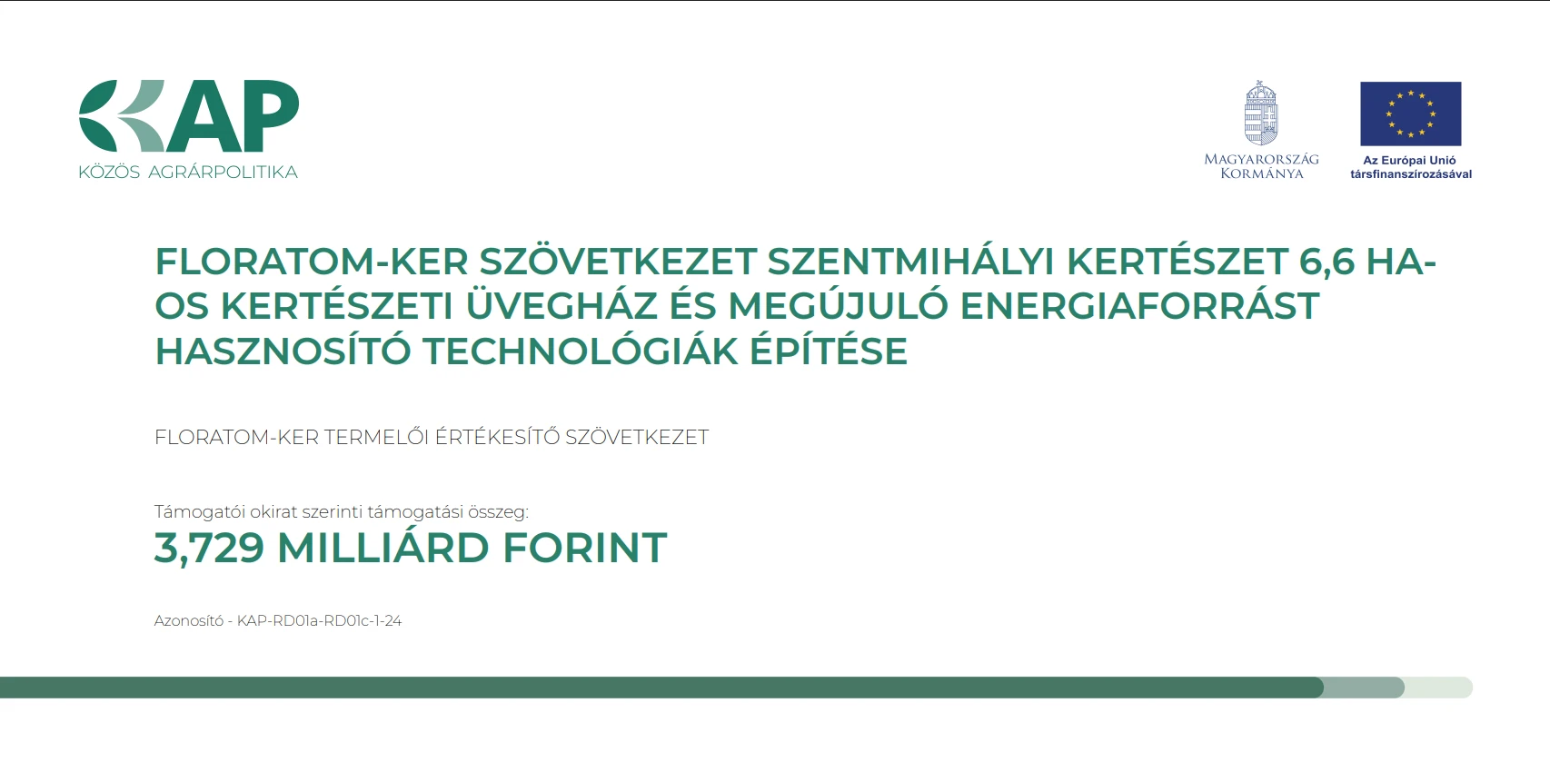 - Projekt címe: „Floratom-Ker Szövetkezet Szentmihályi kertészet 6,6ha-os kertészeti üvegház és megújuló energiaforrást hasznosító technológiák építése”